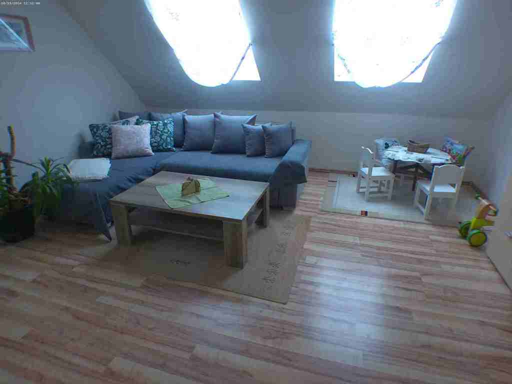 Die Sitzecke mit großem Tisch und Kinderhochstuhl