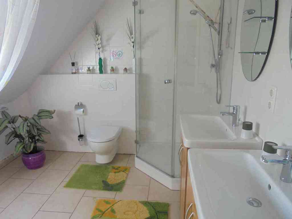 Das lichtdurchflutete Badezimmer verfügt über eine große Dusche,